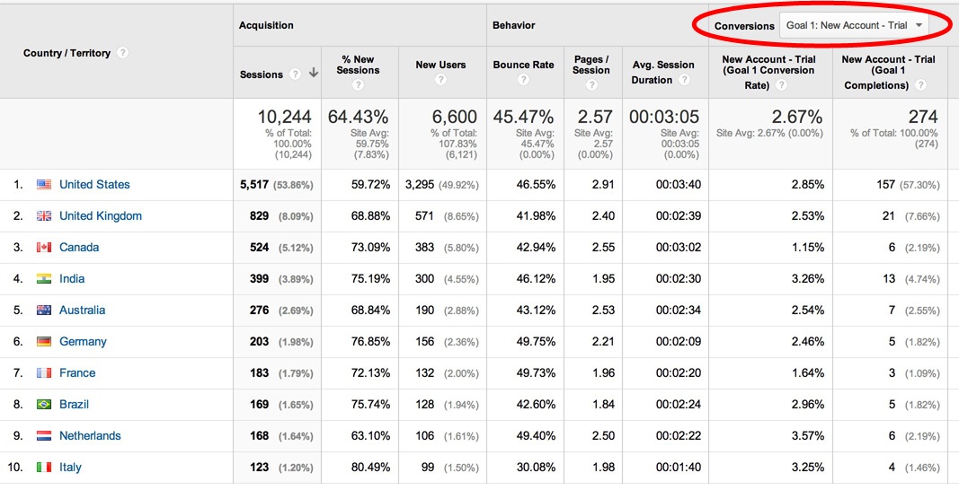 In the image shown below, we are looking at the conversion rate for Megalytic trial accounts across the country dimension. You can pick which goal to display using the selector in the upper right corner (circled in red).