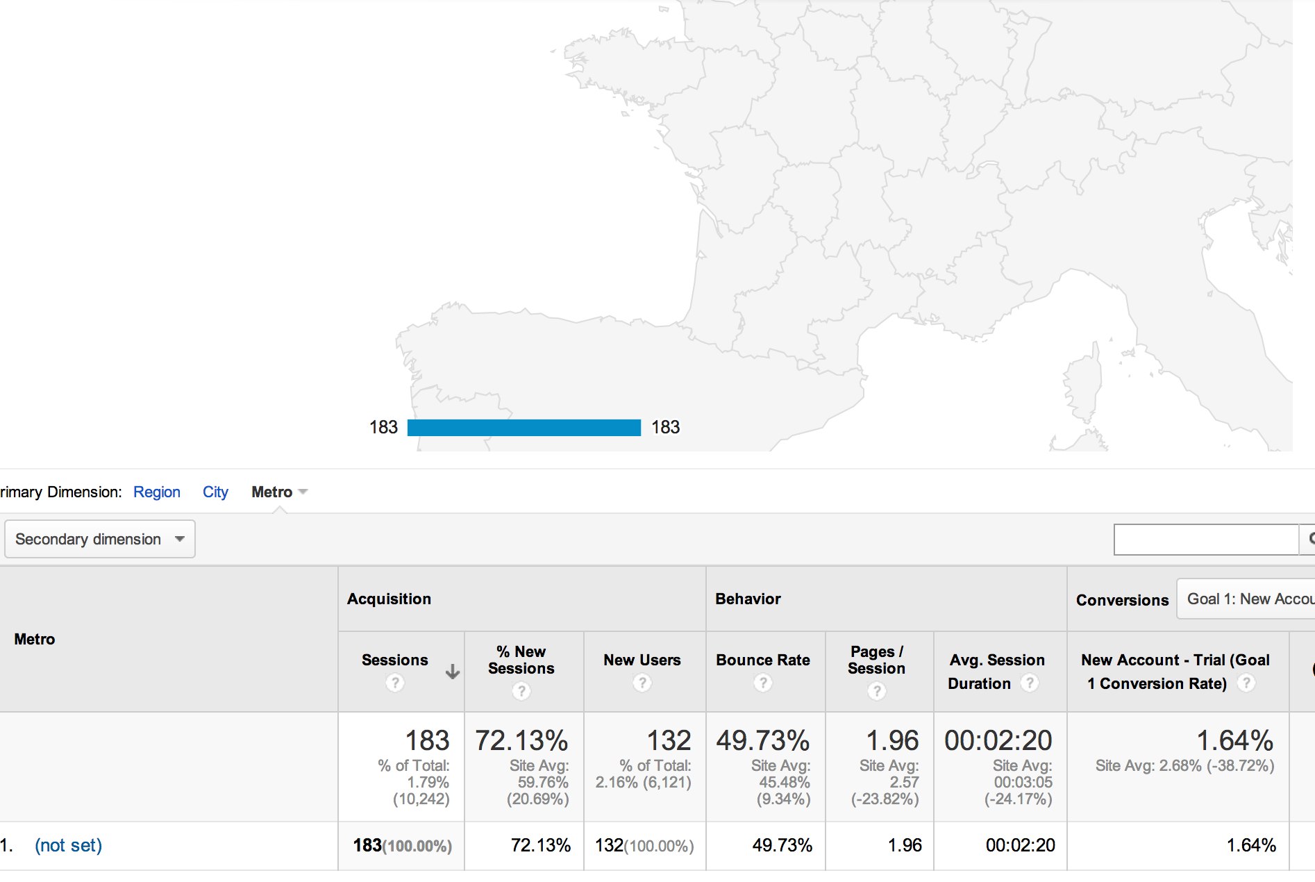 Note, that not all the geographic dimensions provided by Google Analytics are defined in all countries. For example, the metro dimension does a good job in the US of segmenting visits by greater metropolitan area. However, in France, the metro dimension is not defined – so if you select it when looking at France, you will see a blank map, and the table will show all the visits as coming from “(not set)”.