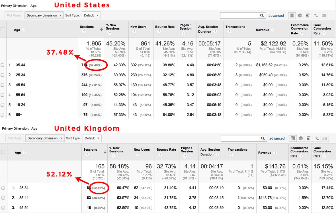 For example, below you will see a custom report that breaks down visits by Country and Age (click on a country to see the age break-down). When I drill down into this report, I can compare traffic from the USA vs United Kingdom, and see the 25-34 age group makes up a much higher percentage of the UK audience than the US audience (52% vs 37%). In fact, in the UK, those under 45 make up more than 90% of the audience, whereas in the US, it is only 68%.
