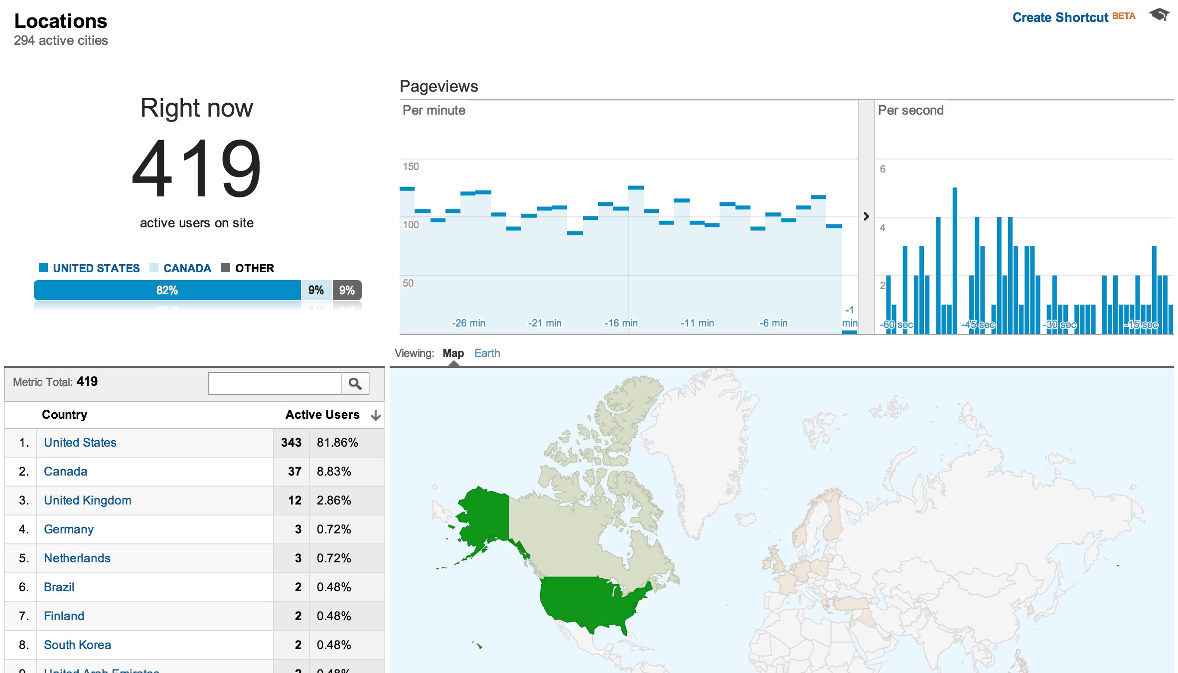 You can also use Google Analytics to see what countries your traffic is coming from in real time. This can be useful, for example, when you publish new content, or a story about your company is getting picked up on social media, and you want to see where the most interest is coming from.