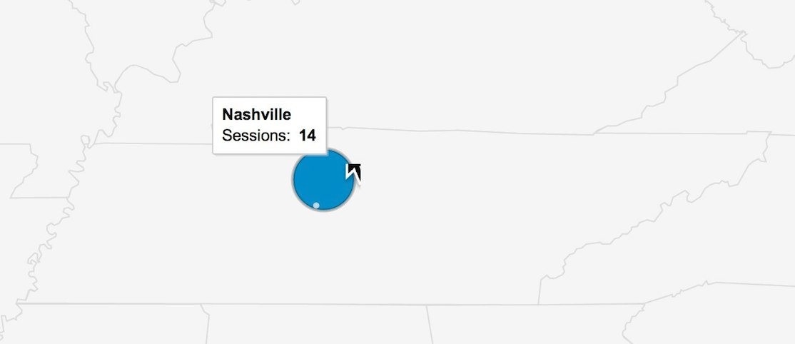 Next, we opened the Audience > Geography > Location report, applied this segment, and drilled down to look at the United States. The map showed an interesting pattern – a high concentration of users in Tennessee who found us via Facebook, and created accounts.