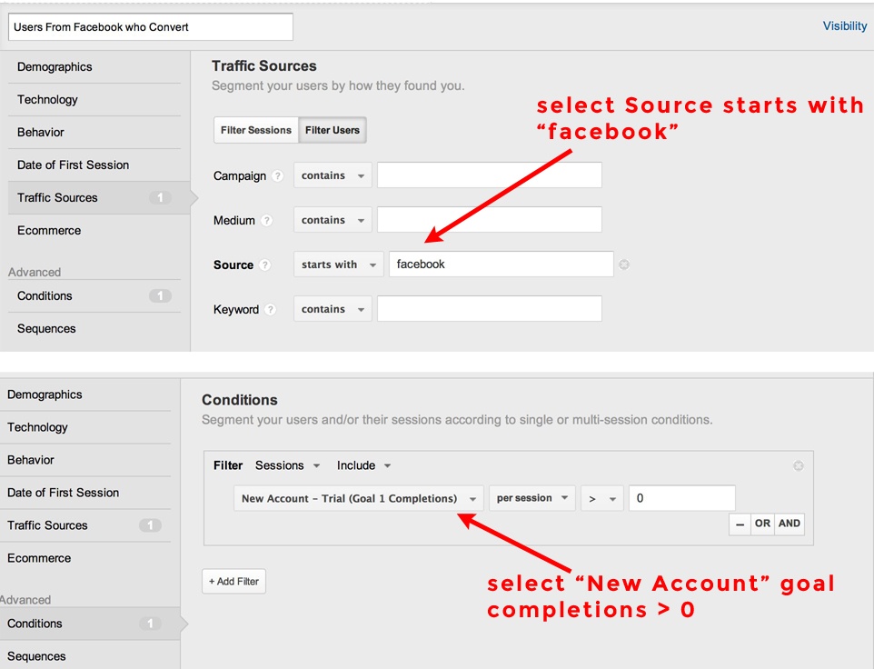 You can use this to find Facebook influencers by looking for concentrations of traffic or conversions in specific local geographies. To do this, first create a segment that isolates uses who find your content via Facebook. If you want, you can also include conversions in the segment, as we have done below. See Google’s documentation on how to Create a new segment for detailed instructions on how to create these kinds of segments.