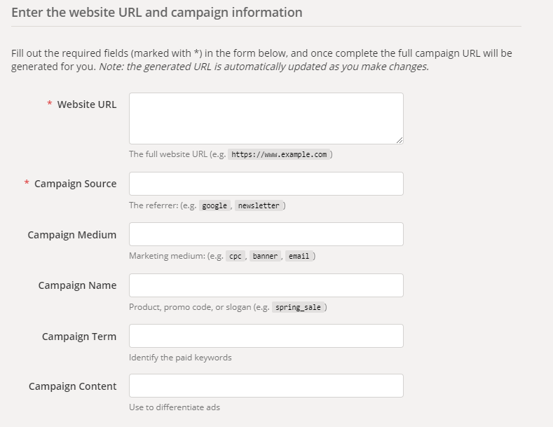Google’s URL builder, shown below, provides a form where you can enter each of the UTM paramters and generate a properly tagged URL for tracking your email link clicks.