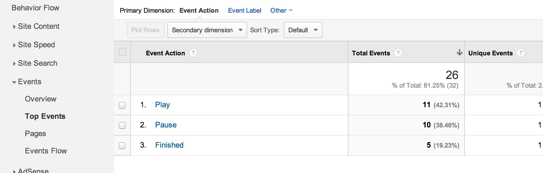 You'll notice in the above code that we use Google Analytics Event Actions named "Play", "Pause", and "Finished". These are the Action dimensions that will show up in our Google Analytics reports to track interaction. You may also notice that we've included a pauseFlag variable. This is used to prevent excessive tracking of Pause events. For example, if the user slides the video player control back and forth to rewind or fast forward, a bunch of spurious Pause events are generated by the YouTube API. We don't want to track these, so we only register a Pause event with Google Analytics after a Play event has been tracked. To implement this, the pauseFlag is set to false, except after a Play event. Another quirk to note is that YouTube fires a Pause event right before the video finishes. So, even if the user doesn't do a Pause, you'll see one Pause event for every Finish event.