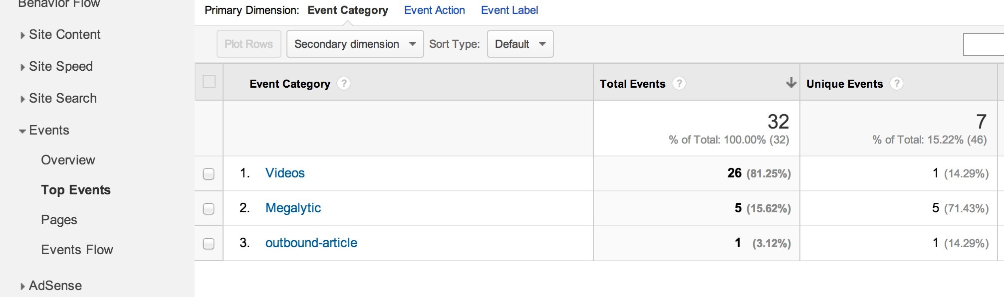 Wait a little while (data should start showing up within 2 hours), and then go to Google Analytics to see the events. The category we are using on this blog page is "Videos", so when I open up Google Analytics and navigate to Behavior >> Events >> Top Events, here is what I see.