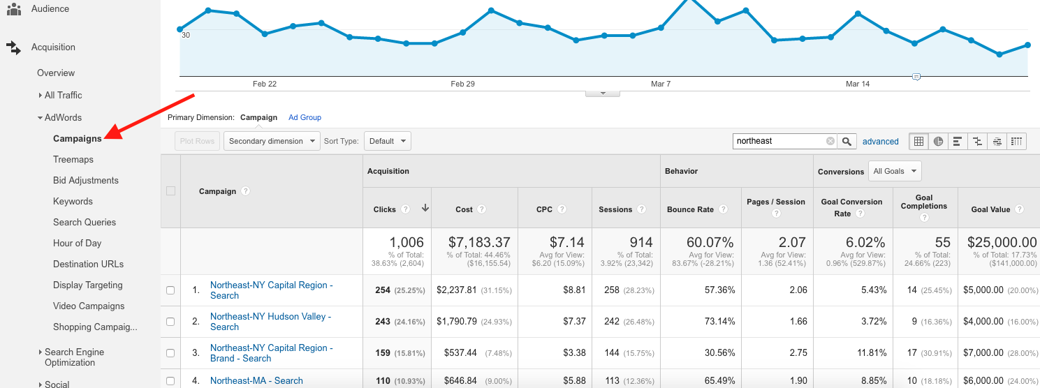 When running advertising through AdWords, make sure you link your AdWords account to Google Analytics. If you haven’t connected the accounts together, AdWords Sessions will still be classified as “Paid Search”, but Analytics will not know which campaign, ad, or keywords drove the traffic. This lack of data will prevent you from accurately measuring the success of individual AdWords campaigns. If you are a digital agency, or in-house marketer, this missing information could undermine your ability to demonstrate the success of your PPC campaigns.