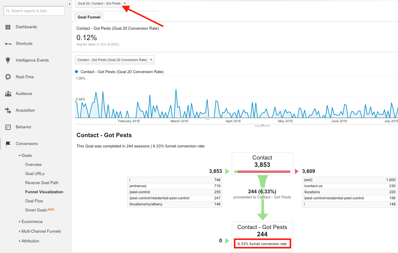 Further down, we can see the final results. 6.33% of people who visit the Contact page actually complete the form and indicated that they need help with pests. People on this page have other options, including asking questions about a bill as a current customer, so this conversion measures the most lead-focused form submission from this page.