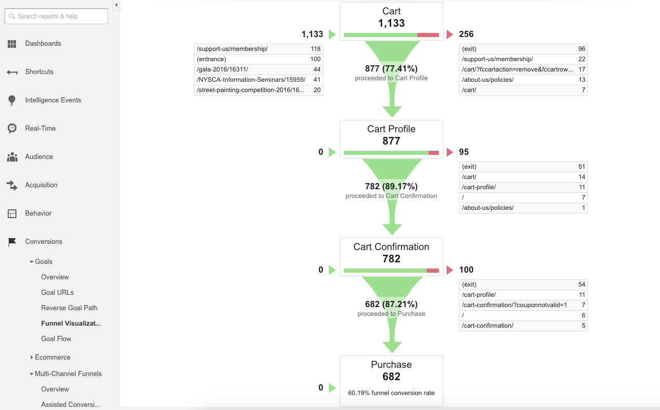 In this example, we can see that 1,133 people entered the cart checkout process and 682 (60%) actually completed it. We can also see that the largest dropoff was from the initial Cart page, where people added a class to the cart.