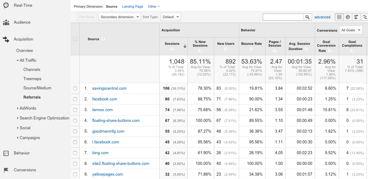 In our example, you’ll note floating-share-buttons.com and site2.floating-share-buttons.com in the report, both of which are well-known Spam Referrals. These represent a total of 107 Sessions to the site, approximately 10% of the Total Referrals in this timeframe.