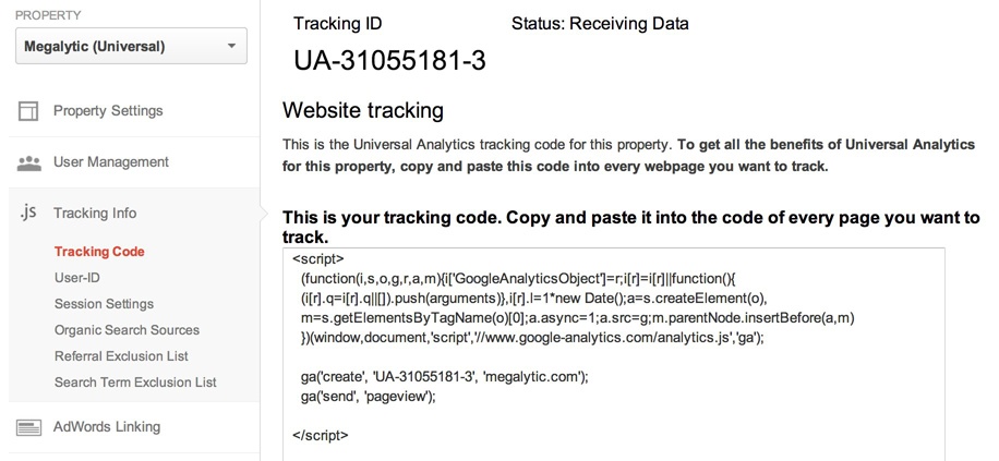 To find the code for loading analytics.js, open your Admin page again, and look in the middle column under Tracking Info >> Tracking Code. You can copy and paste the code from the box on the right, as shown below.