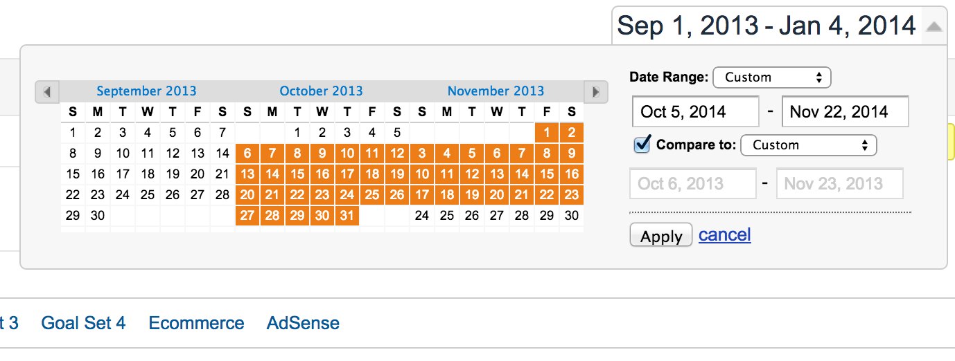 Once you have selected the date range of interest for last year, you can compare with this year by clicking on the Google Analytics date selector and checking the “Compare to” box.