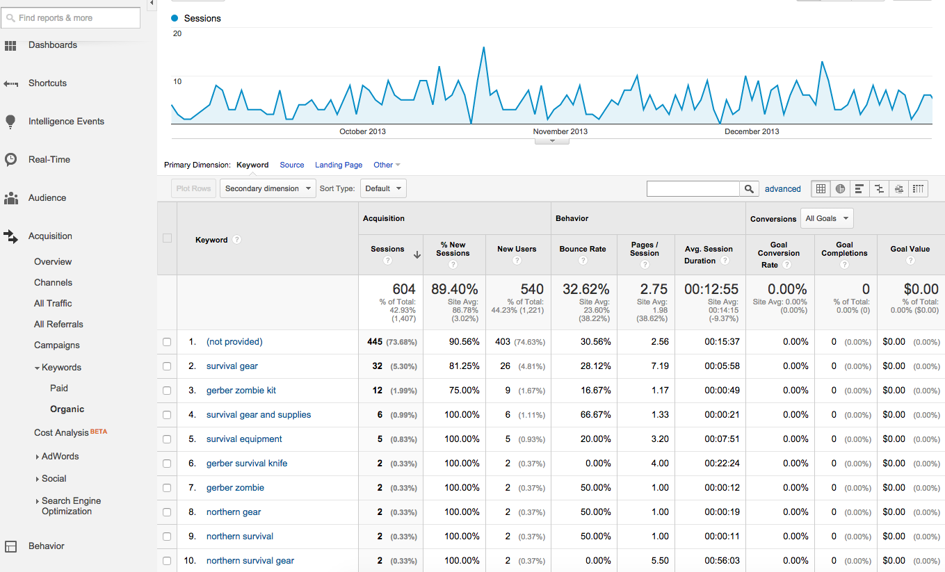 Although most of the keywords are, unfortunately, hidden thanks to “not provided”, we can see that “survival gear” ranks high as a general brand-related search. In addition, “gerber zombie kit” is a top search related to a product available on the site, likely a popular Christmas gift last year.