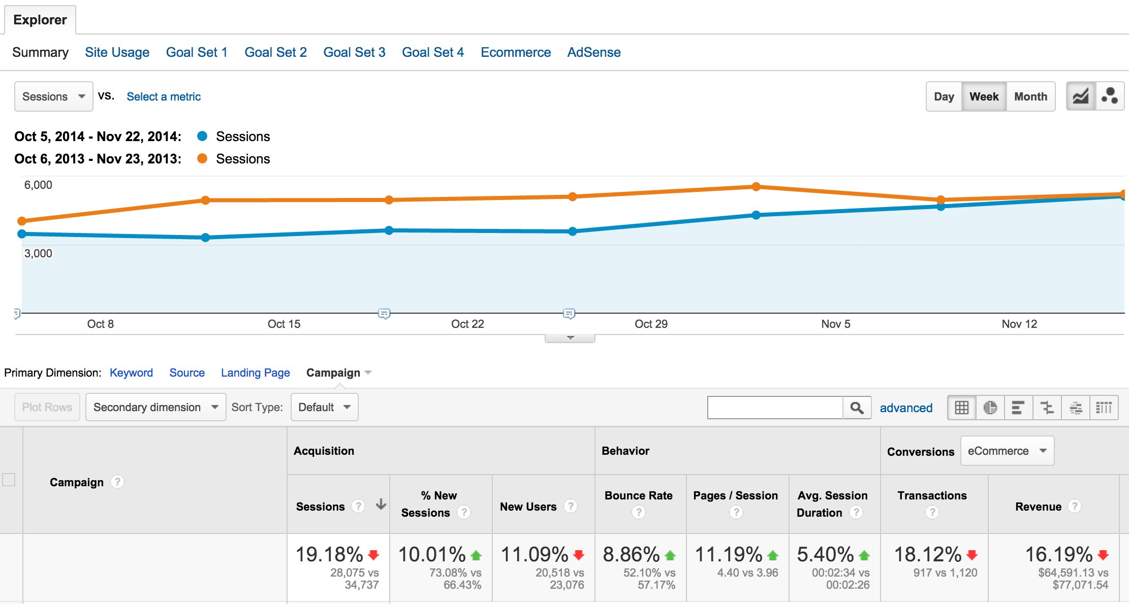 Here, you can see that Sessions from Paid Search lag 19.18% behind last year, and Revenue is behind by 16.19%. Next, we want to look at the Campaign level within Paid Search. To do that, click on the “Other” menu for “Primary Dimension” along the top of the table, and select “Campaign”.