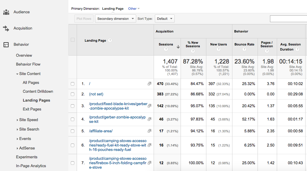 In this example, you can see that, besides the homepage, the Zombie Apocalypse Kit once again shows as a popular product. Based on this data, writing blog articles about this item, as well as featuring it on social media, would help to drive additional traffic to your website, supplementing the traffic going to existing product pages. In addition, noting top pages, such as the camping stove, with less volume but decent bounce rate/session duration indicates opportunity for additional content. Further development of pages can help drive awareness for products that may not currently be as popular but still show opportunity to generate revenue.