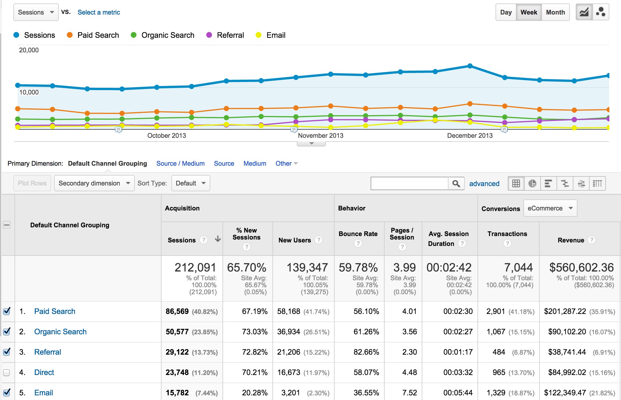 First, start by looking at big picture trends to get a general idea of how many more potential customers and sales you should expect during the holidays. Start by looking at the volume of traffic leading up to and during last year’s holiday season. Note the dates when sessions began to increase leading up to the holidays. In this example, we show traffic for the last four months of the year, by channel. We generated this report in Google Analytics by going to Acquisition > Channels. Here we can see when traffic started to pick up and where it came from.