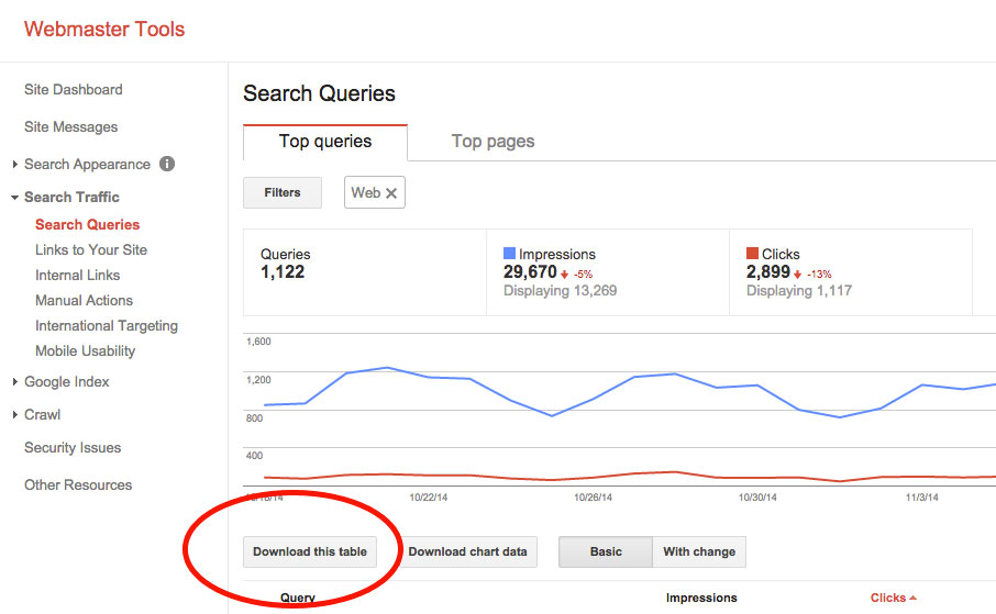 To download current keyword data, log into your Webmaster Tools account, select your site, and navigate to Search Traffic > Search Queries. Choose your desired date range and select “Download this table” to download the search query data in either CSV or Google Docs format. You should then plan to export data regularly (at least once every three months) to ensure you can look back on search queries next year when you begin planning for the holiday season. Don’t forget to export records throughout the year - are you a business that provides products for Back to School shopping? Swimsuits for the start of summer? This same advice applies.