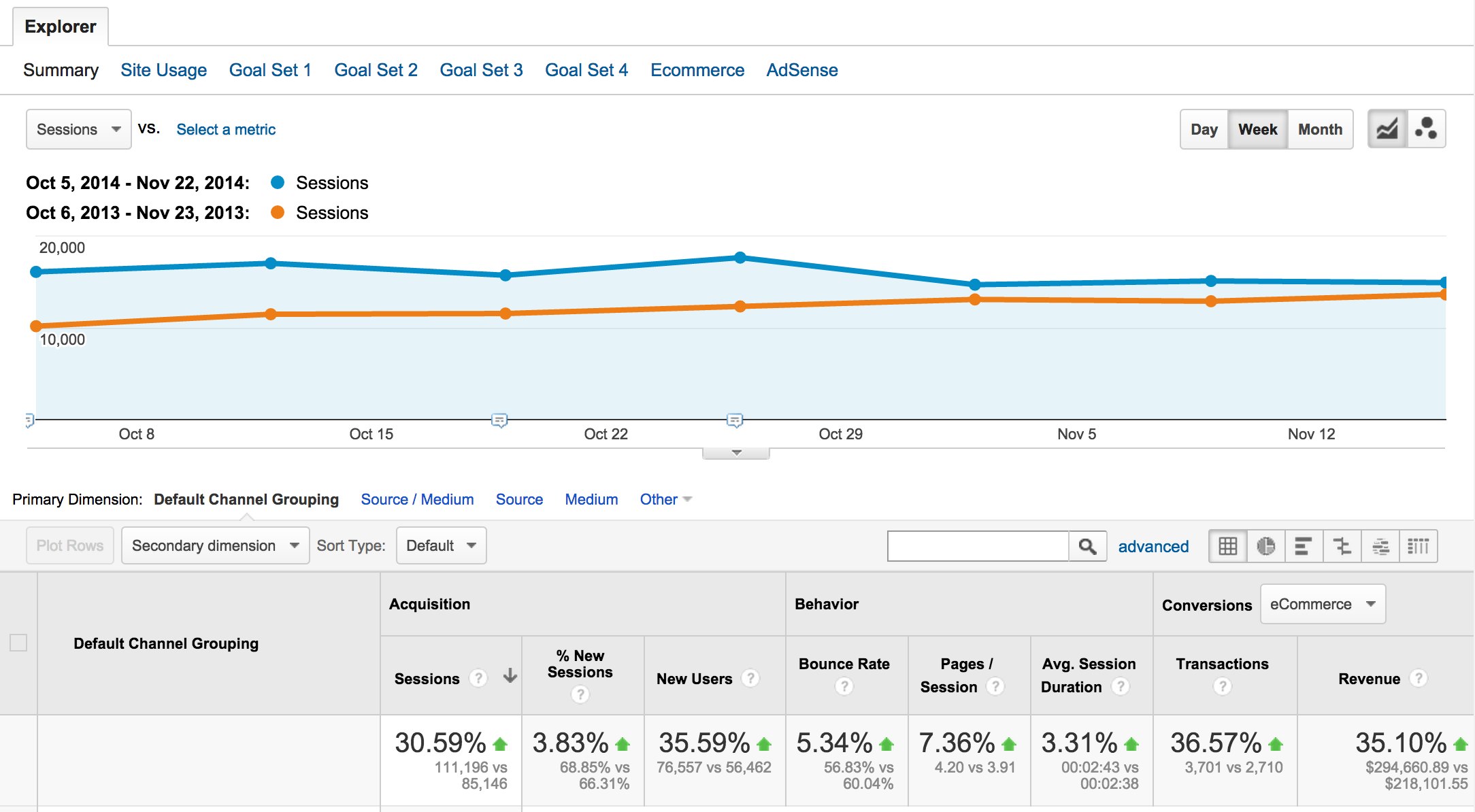 When making this comparison, it is helpful to uncheck the selected Channels and click “Plot Rows” again – as comparing across date ranges for multiple Channels makes the chart hard to read. The result shows that, so far this year, this business is running ahead of last year. Sessions have increased by 30.59% and Revenue is up 35.10%.