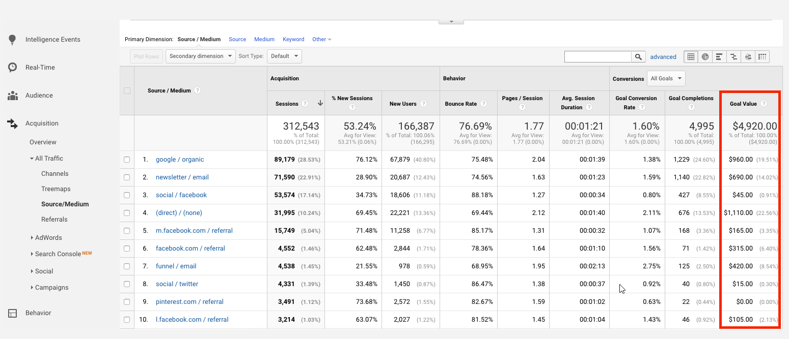 Even if you know the average revenue you make per lead that comes into your business, you can approximate ROI by setting a value per lead. For instance, if you receive around $1,000 per lead and you get 20 leads, you can estimate a return of $20,000. Setting a Goal Value will allow you to measure this directly in Google Analytics.