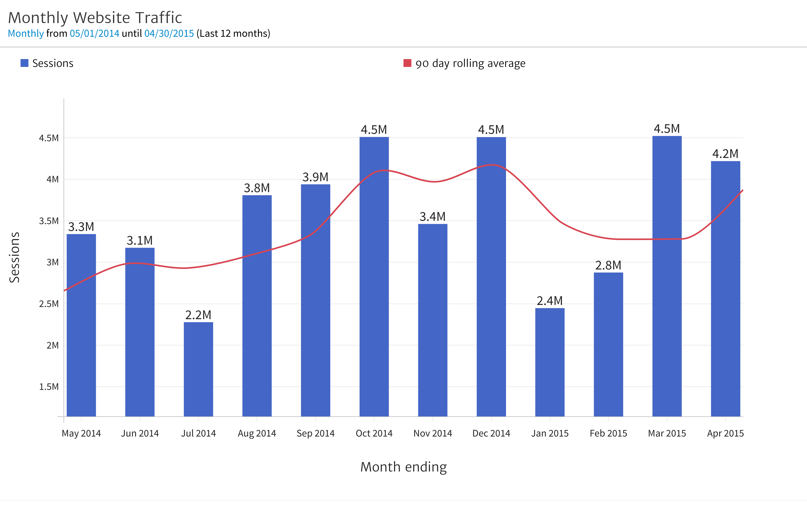 To show the monthly website traffic for Texas over the last year, you would start with the Rolling Average Comparison widget that displays the monthly traffic, as well as the 90 day rolling average that provides a smoothed out view of the monthly ups and downs.