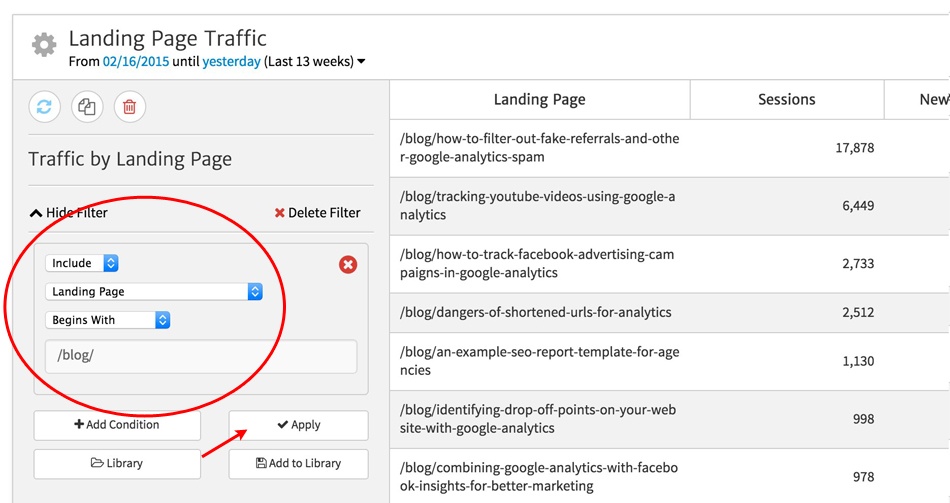 This opens up the filter editor. Almost all Megalytic widgets have a filter editor. In this case, we want to restrict reporting to blog traffic. To set up the filter, we need a pattern that only matches blog posts. In this case, the blog is hosted at http://megalytic.com/blog/. So, we set up the filter to include only Landing Pages that begin with “/blog/” and then click “Apply.” The Landing Page table for this widget now shows only the traffic coming to the blog.