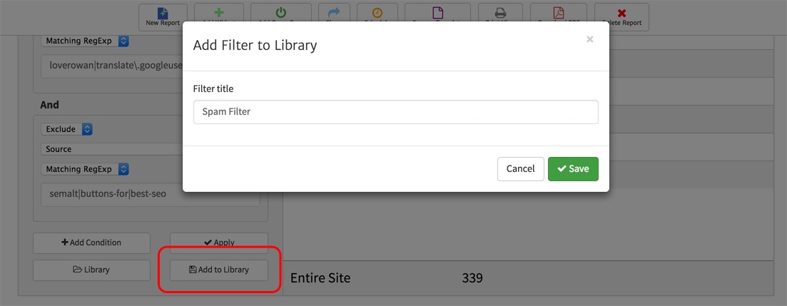 Sometimes, you want to apply the same filter to lots of different widgets. Megalytic makes it easy to do this by saving your filters to the Filter Library. Once you have a filter you like, simply click on “Add to Library” and give the filter a name.