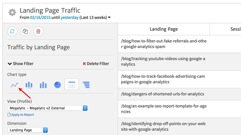 In Megalytic, start by dragging the Traffic by Landing Page widget into a report. Open the widget editor, and click on “Show Filter.”