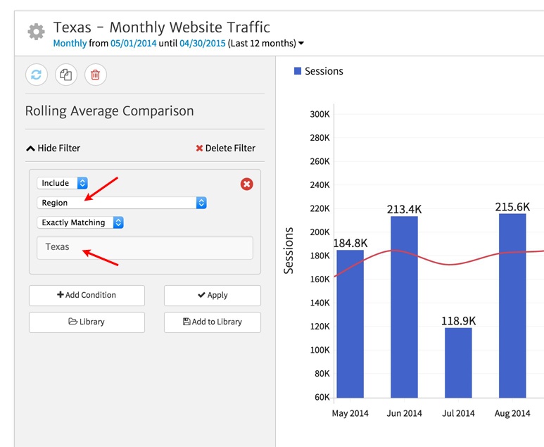 To turn this into a chart that only shows the traffic coming from Texas, you open the widget editor and set it to include only data where the Region exactly matches with “Texas.” In Google Analytics (and therefore in Megalytic), the Region dimension translates to states in the USA.