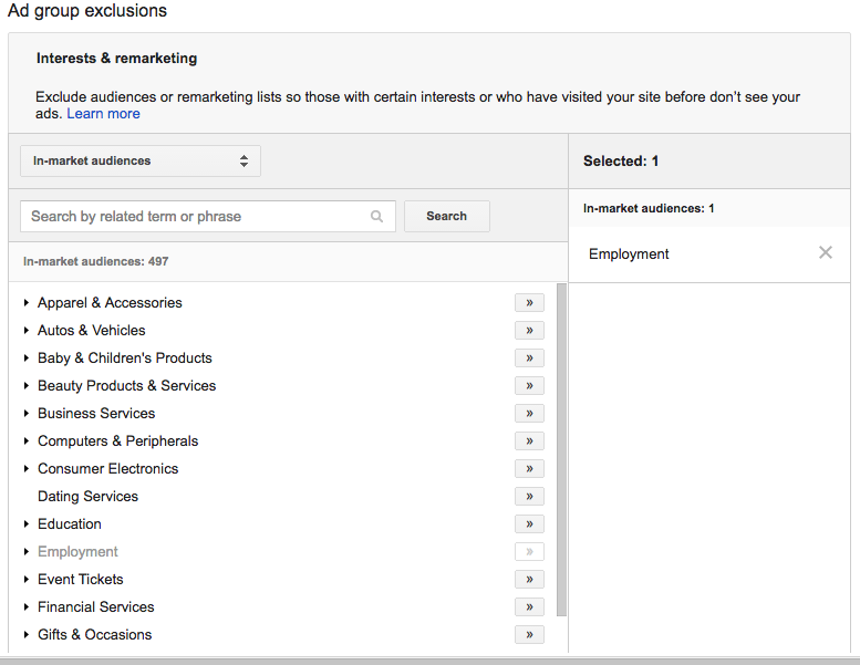 Also, we want to exclude the Employment category to keep job seekers from clicking on ads. To do that, we’ll scroll further down on the same page until seeing Ad Group Exclusions. Here, we’ll choose the Employment category.