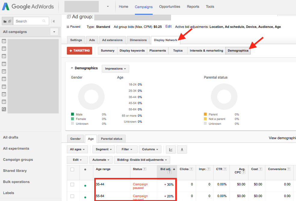 From this research, we can then move to apply what we learned to bids in AdWords. Navigating to our desired AdWords display campaign and ad group, we’ll select the Demographics tab. Within that section, choose Demographics to see options for setting bids by age and gender.