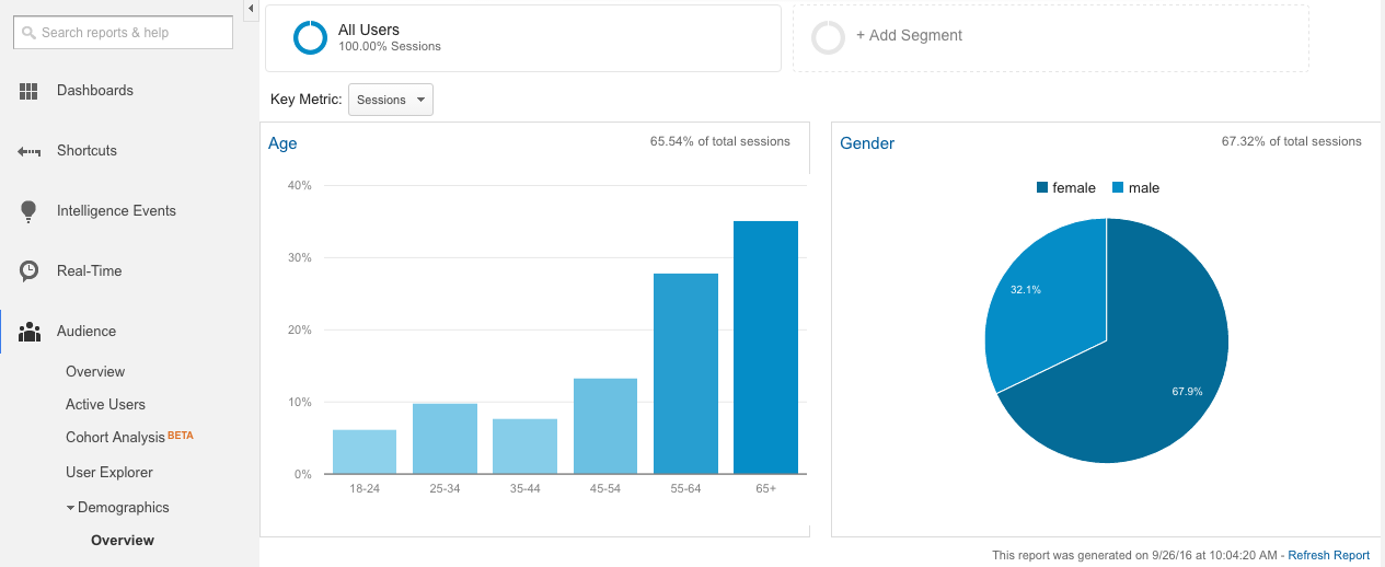 This example, from a retirement community’s website, shows 65+ as the highest age bracket, with 55-64 close behind. In addition, users are predominantly female.