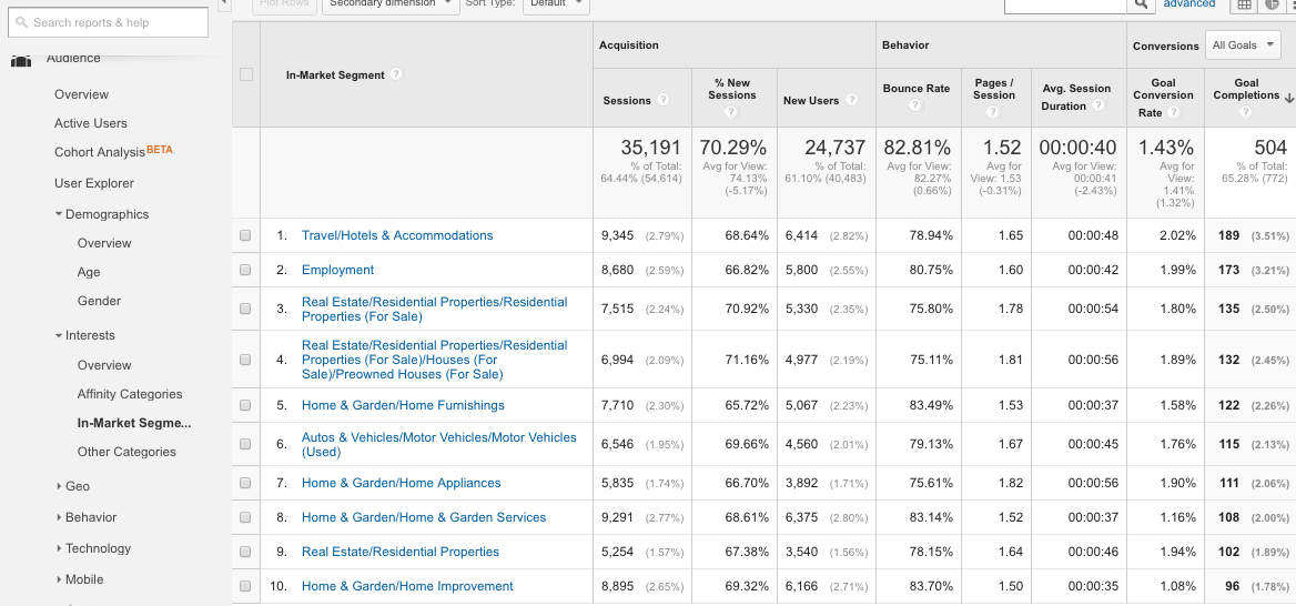 Next, see that Employment is the second highest converting category, likely due to job seekers filling out the contact form on the site. Extrapolating the user intent helps designate this as a good category to exclude from interest targeting, as typically you don’t want to pay for job seekers to click ads.