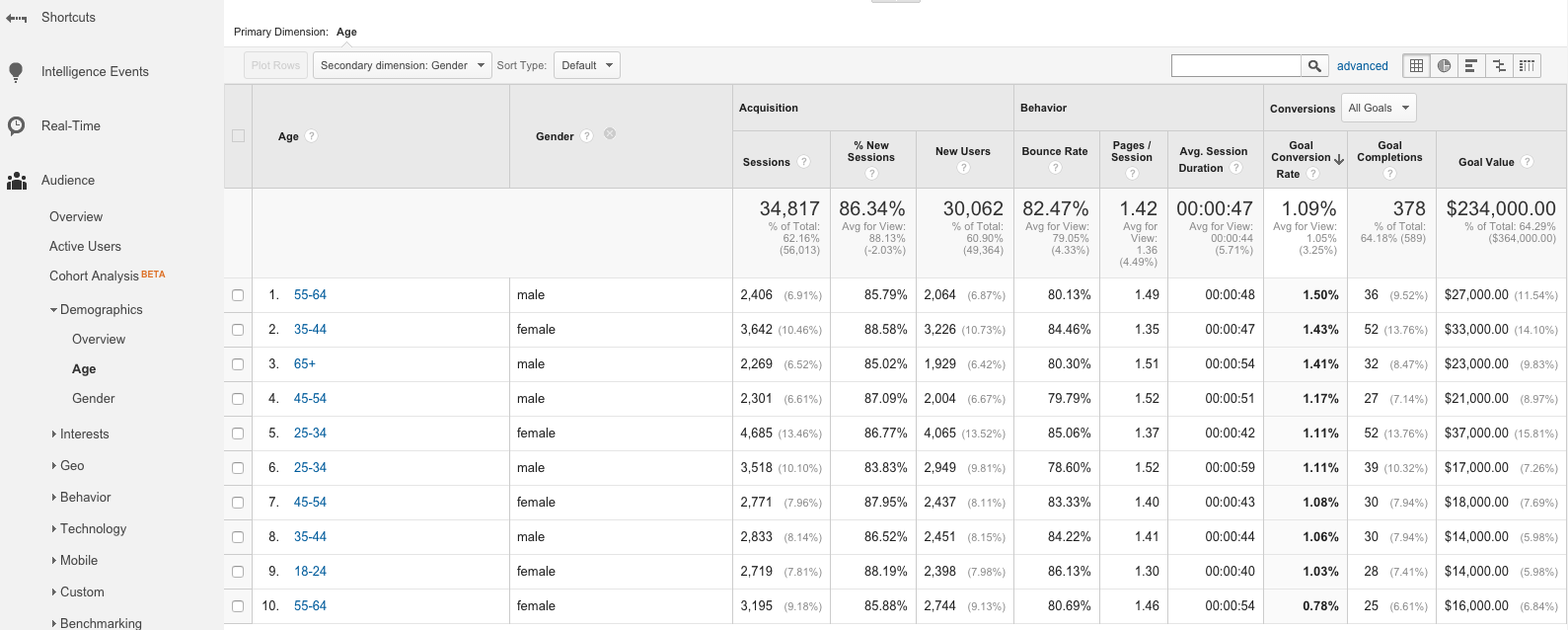 Here, we’ll sort by Goal Conversion Rate, looking at the likelihood of each category to submit a lead form on the site. As a result, we see males 55-64 are the most likely to convert. Close behind are females 35-44. We also note that females 35-44 and females 25-34 tie for the highest number of total Goal Completions, with females 25-34 having the highest Goal Value (an approximate value attached to each lead generated on the site).