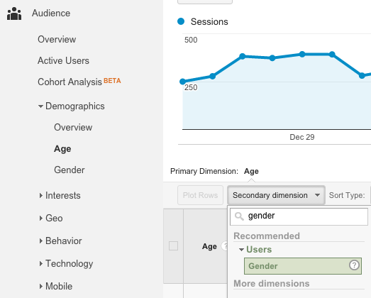 We’ll look at the Age report (Audience > Demographics > Age) to break down metrics on a deeper level. Here, we’ll opt to add a Secondary Dimension to allow us to look at categories by both age and gender. To do so, click the Secondary Dimension and choose Gender (note you can type in the search bar to find your desired dimension more quickly).