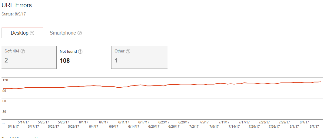 Under “Crawl Errors” you will find a list of the 404 errors Google has found on your site. It’s important to know that 404 errors are a normal part of a website’s life and they are not inherently a bad or troublesome issue that will negatively affect your positioning in search. However, there are a few cases where this is something you’ll want to address.