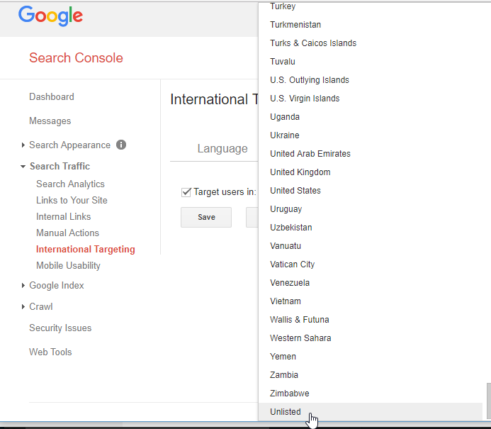 You can also use the Country tab to set target geographical locations. You can use this with TLDs (top level domains), subdomains and directories. However, each subdomain or directory will need its own SC profile to set a specific target country. Finally, if you are using the same content to target multiple countries, you can choose “unlisted” to target multiple countries.