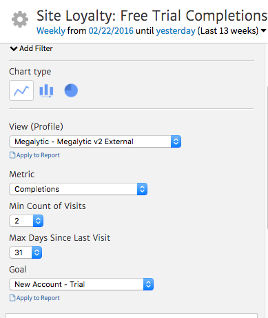 As one example of customizing this widget, let’s look at how site loyalty impacts the likelihood of users converting to free trial subscriptions. To set this up, we’ll change the Metric to Completions and set Minimum Count of Visits to 2. In addition, we’ll set Max Days Since Last Visit to 31, looking back a month to cover people who may have looked at a blog post and then come back. With this setup, we’ll compare people who made just one visit with those who returned to the site at least once.