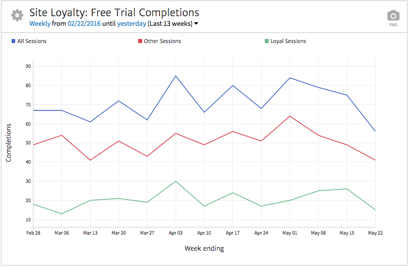 In the resulting graph, we can see that more conversions result from Other Sessions (new visits or people who haven’t been tracked as coming to the site, at least within the last month) than Loyal Sessions. However, we do note a steady flow of signups from the loyal visitors.