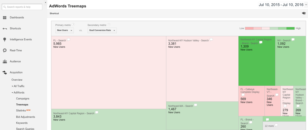 In addition to the main Google Analytics Treemaps report, you can access an additional Treemaps report specific to AdWords under Acquisition > AdWords > Treemaps. As long as you’ve linked an active AdWords account to your Google Analytics account, you’ll see data here to help evaluate AdWords campaign metrics. You can pinpoint campaigns that you should prioritize working on to improve conversion performance.
