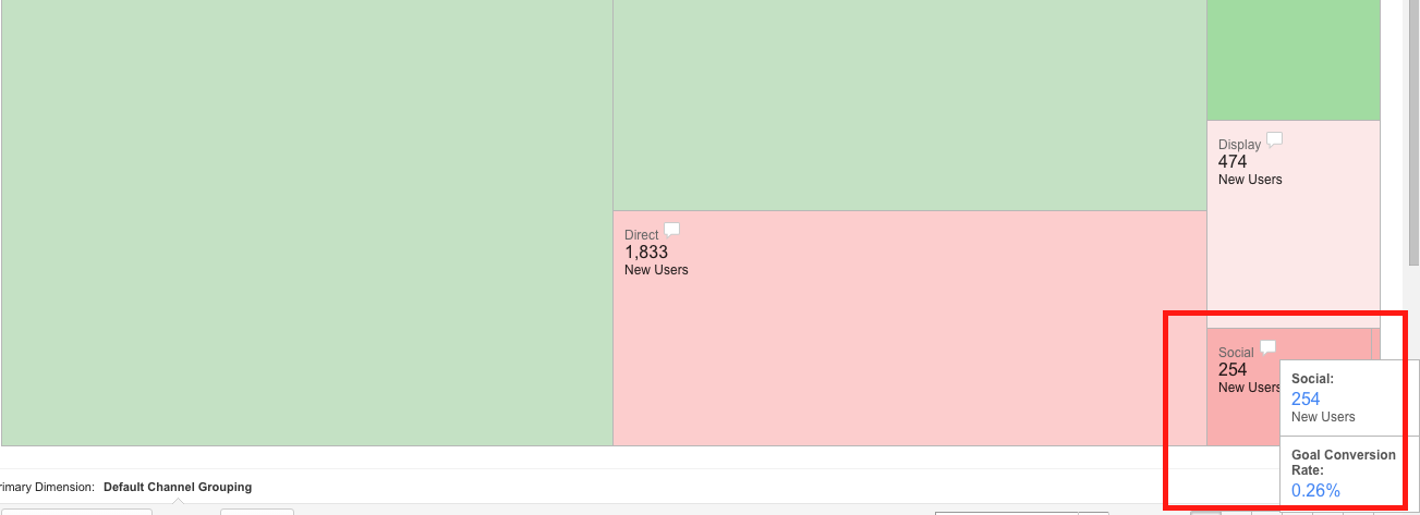 You can mouse over the speech bubble in any rectangle to see more specific numbers. For instance, here we can see that Social has a conversion rate of just 0.26%.