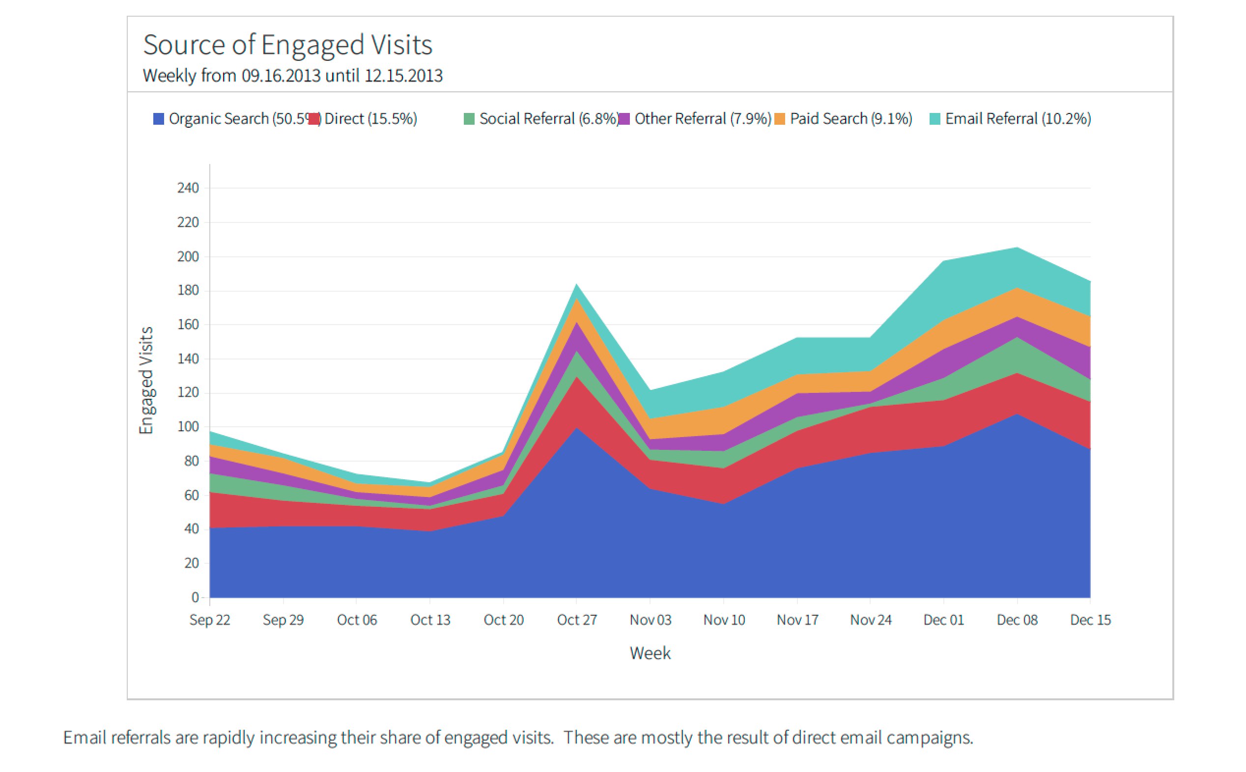 Notice that in the case, the summary text for this chart points our the primary insight gained by drilling down along the time dimension. "Email referrals are rapidly increasing their share of engaged visits".